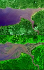 The highest tides on Earth occur in the Minas Basin, the eastern extremity of the Bay of Fundy, Nova Scotia, Canada, where the tide range can reach 16 meters when the various factors affecting the tides are in phase. The primary cause of the immense tides of Fundy is a resonance of the Bay of Fundy-Gulf of Maine system. The system is effectively bounded at this outer end by the edge of the continental shelf with its approximately 40:1 increase in depth. The system has a natural period of approximately 13 hours, which is close to the 12h25m period of the dominant lunar tide of the Atlantic Ocean. Like a father pushing his daughter on a swing, the gentle Atlantic tidal pulse pushes the waters of the Bay of Fundy-Gulf of Maine basin at nearly the optimum frequency to cause a large to-and-fro oscillation. The greatest slosh occurs at the head (northeast end) of the system. The high tide image (top) was acquired April 20, 2001, and the low tide image (bottom) was acquired September 30, 2002. The images cover an area of 16.5 by 21 km, and are centered near 64 degrees west longitude and 45.5 degrees north latitude.