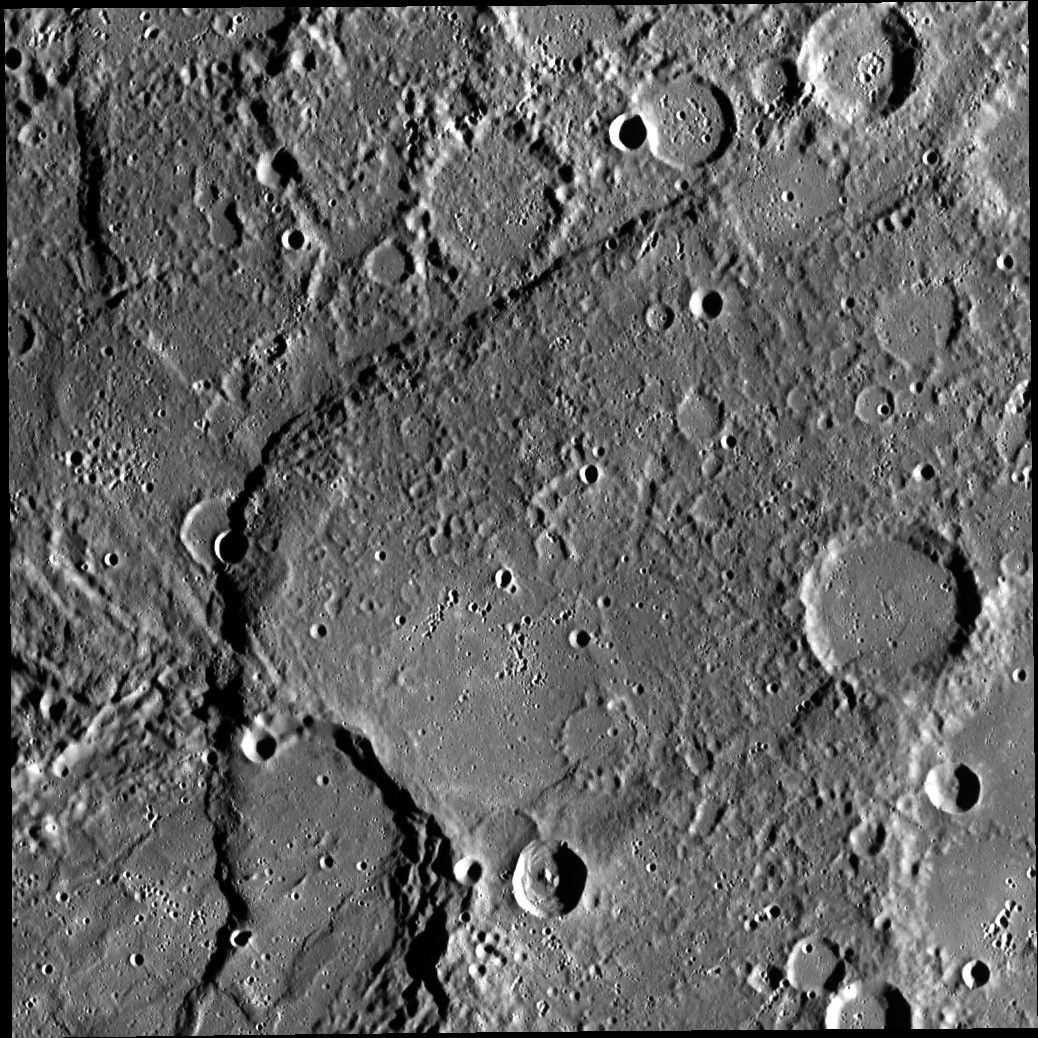 The arcuate ridge in this image, Beagle Rupes, is one of the tallest and longest scarps on Mercury. It is shown here deforming and shortening the elliptical impact crater Sveinsdóttir in the bottom left corner of the image. Beagle Rupes and other scarps on Mercury are thought to be the surface expressions of thrust faults that formed from contraction as the planet's interior cooled.