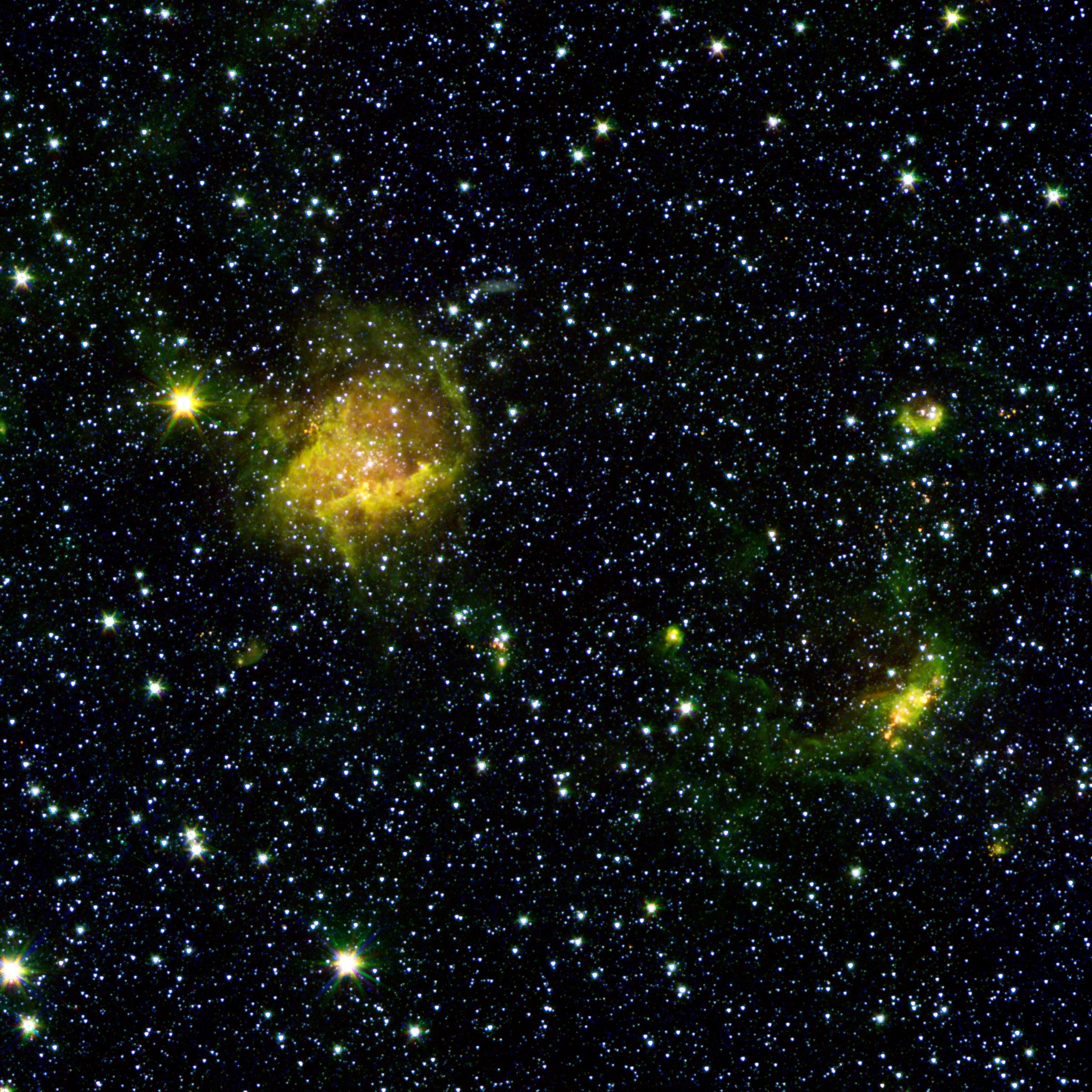 This image is a combination of data from Spitzer and the Two Micron All Sky Survey (2MASS). The Spitzer data was taken after Spitzer's liquid coolant ran dry in May 2009, marking the beginning of its "warm" mission. Light from Spitzer's remaining infrared channels at 3.6 and 4.5 microns has been represented in green and red, respectively. 2MASS observations at 2.2 microns are blue.