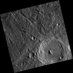 The complex crater Bartok, named for the Hungarian composer and pianist Bela Bartok, contains a prominent central peak. Chains of secondary craters formed by Bartok's ejecta can be seen across the entire image.