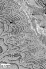 NASA's Mars Global Surveyor shows layered sedimentary rock outcrops in Becquerel Crater of western Arabia Terra on Mars. These materials were deposited in the crater some time in the distant past, and later eroded to their present form.