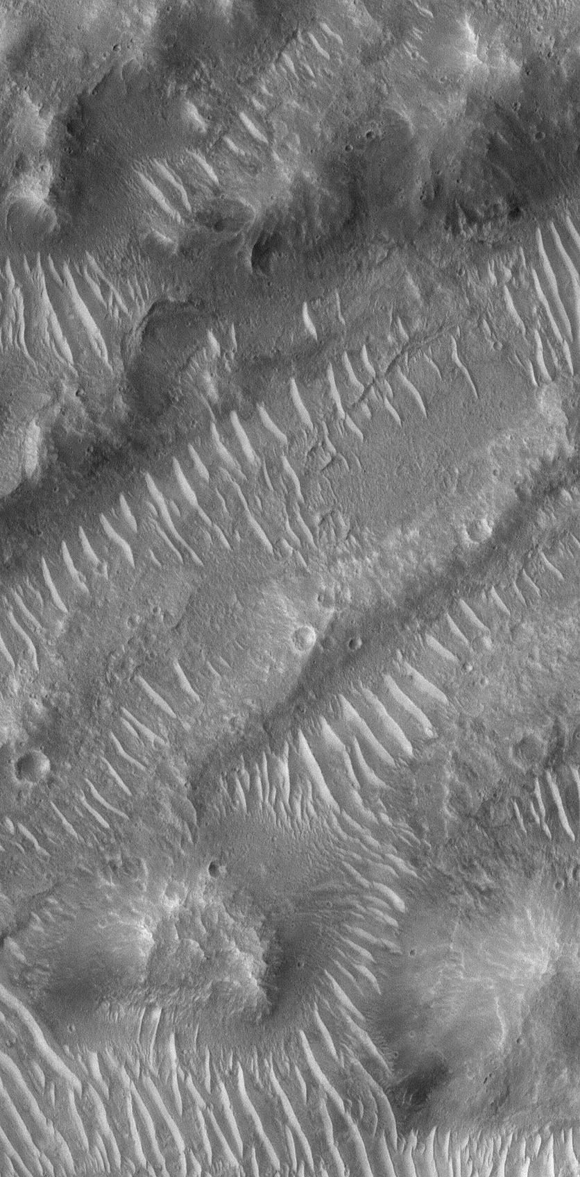 This Mars Global Surveyor (MGS) Mars Orbiter Camera (MOC) image shows large, light-toned, ripple-like windblown bedforms in a portion of the giant flood channel complex, Maja Valles. Ripples such as these are very common on Mars but not very well understood. They are larger than most ripples on Earth, and smaller than typical dunes. They are usually old, and probably immobile, features. Sometimes, larger, dark sand dunes are seen riding over them (although that is not the case here). If similarly-sized ripples were to be investigated by a Mars rover, they would probably provide critical information that would help determine the nature of bedforms like these all over Mars. The Maja Valles scene shown here is located near 17.7°N, 54.8°W, and covers an area about 1.4 km (0.9 mi) wide. Sunlight illuminates the scene from the lower left.
