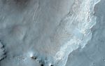 The location of this bedrock and context of its surroundings give us significant clues to the possible water-involved origin of these materials. Numerous channels are carved into the rim of the crater. At this particular location, one such channel has deposited a smooth-textured, fan-like deposit onto the crater floor. The bedrock is now exposed at the edge of this fan-like deposit, which overlies a heavily pitted surface to the north.