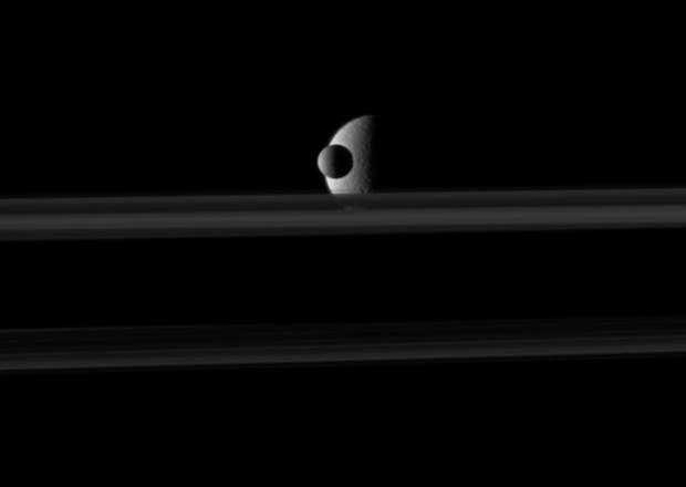 The small moon Mimas passes in front of the larger moon Rhea, which is partly obscured by Saturn's rings, in this movie from NASA's Cassini spacecraft.