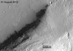 The Aug. 7 image was taken at the same time as a post-landing image taken by the orbiter's High Resolution Imaging Science Experiment camera (see PIA16001). The Context Camera image is 20 times lower in resolution but covers an area almost 20 times larger. The wider field of view and longer image permits the Context Camera to perform reconnaissance for higher resolution targets. A Context Camera image is typically about 19 by 171 miles (30 by 275 kilometers) but because the camera was looking at an angle, it covered a swath about 26 by 171 miles (42 by 275 kilometers).