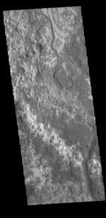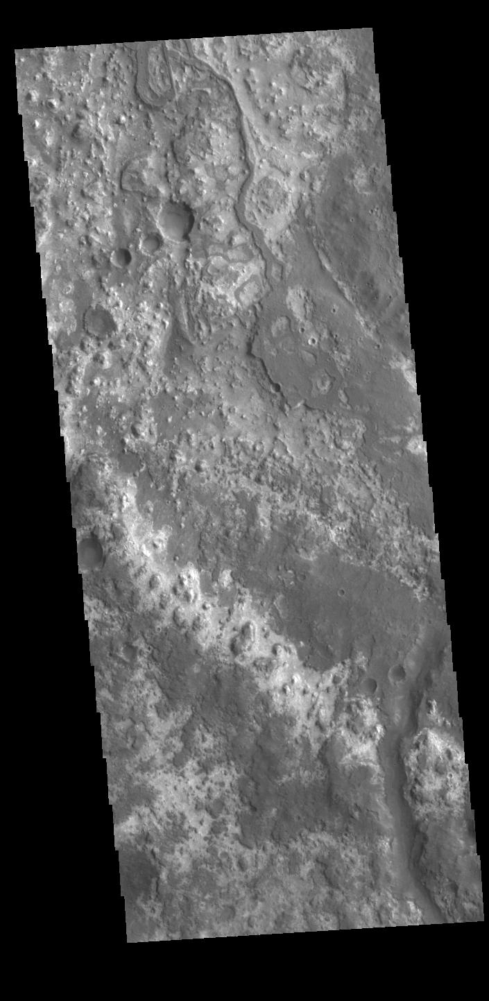 Today's image shows the channel floor of Mawrth Vallis. Of all the channels carved by flowing water on Mars, one of the more unusual is Mawrth Vallis, whose name comes from the Welsh word for Mars. Mawrth Vallis winds through northwest Arabia Terra for some 640 kilometers (400 miles) before emptying into Acidalia Planitia on the edge of the vast northern lowlands. Unlike many outflow channels that start in regions of chaotic terrain, Mawrth Vallis just appears and then grows deeper as it heads downstream, holding a width of approximately 15 km (9 mi) until it widens near its mouth at Chryse Planitia. And the floor of the channel is a much more complex surface than most channels, with layers of different materials and a decidedly non-waterworn appearance. Today's image is located within an almost 90 degree bend in the channel.
