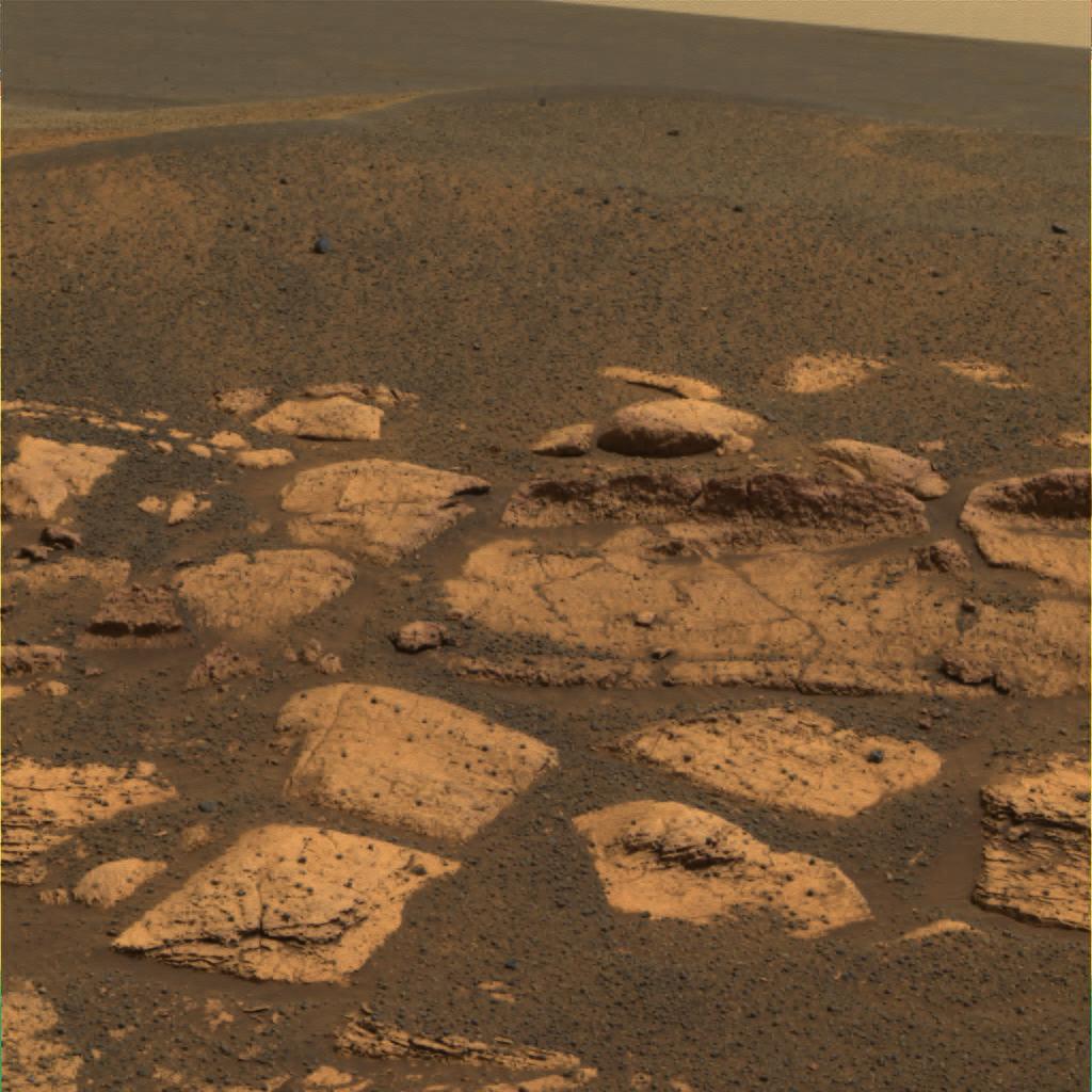 This approximate true-color image suggests that the plains beyond the small crater where the Mars Exploration Rover Opportunity now sits are littered with the same dark grey material found inside the crater in the form of spherules or "blueberries." Because Mars orbiters have observed the iron-bearing mineral hematite across these plains, scientists hypothesize that the blueberries are also made up of this mineral. This image was taken by the rover's panoramic camera on the 17th martian day, or sol, of its mission. Data from the camera's red, green and blue filters were combined to create this image.