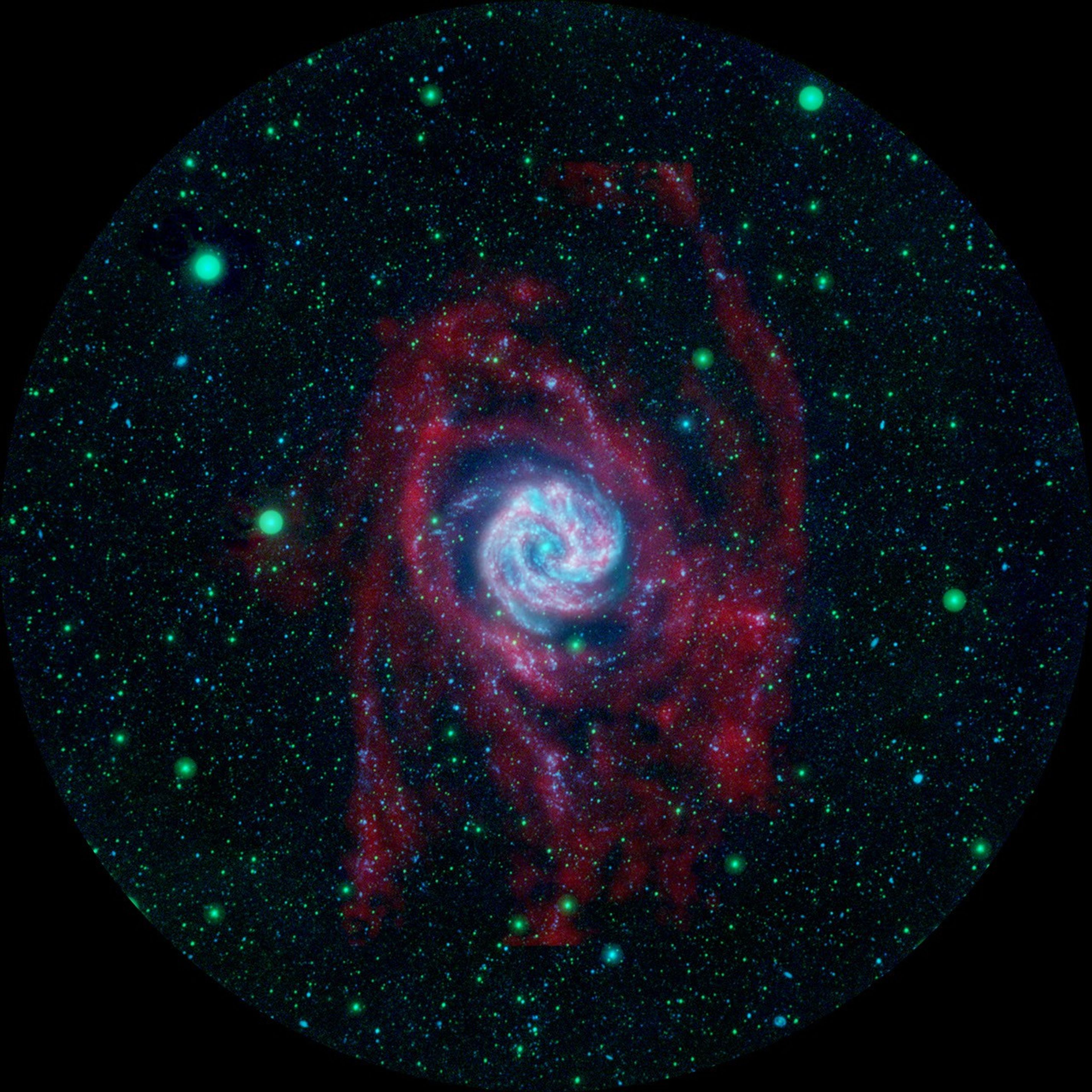 In this image, far-ultraviolet light is blue, near-ultraviolet light is green and radio emission at a wavelength of 21 centimeters is red.