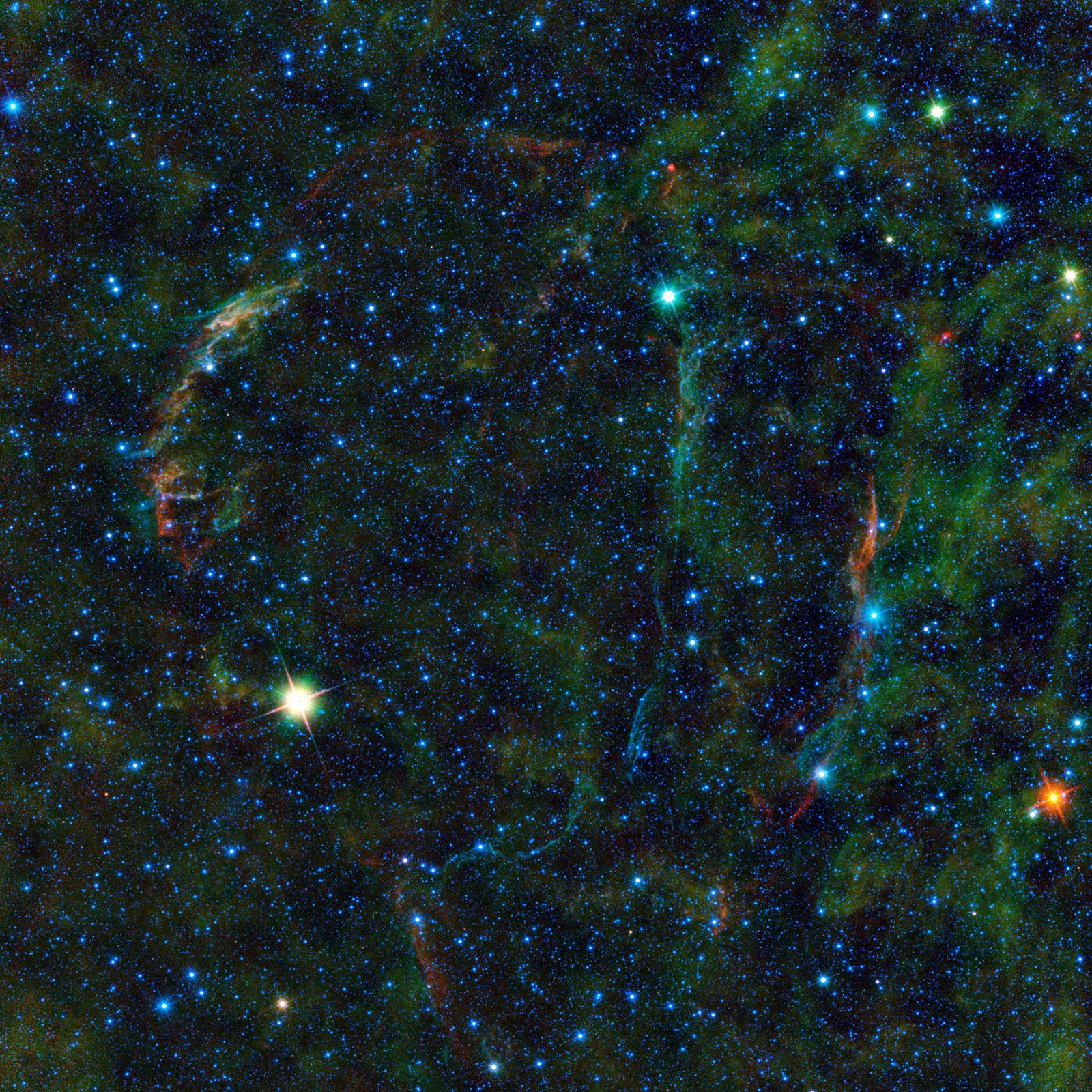 Located in the constellation Cygnus, this supernova remnant, called the Veil nebula, was created when a massive star exploded some 5,000 to 8,000 years ago, sending out shock waves that continue to interact with the gas and dust between the stars. This is among the largest of the WISE images featured so far, covering an area equivalent to nearly nine by nine full moons.