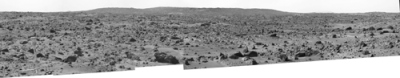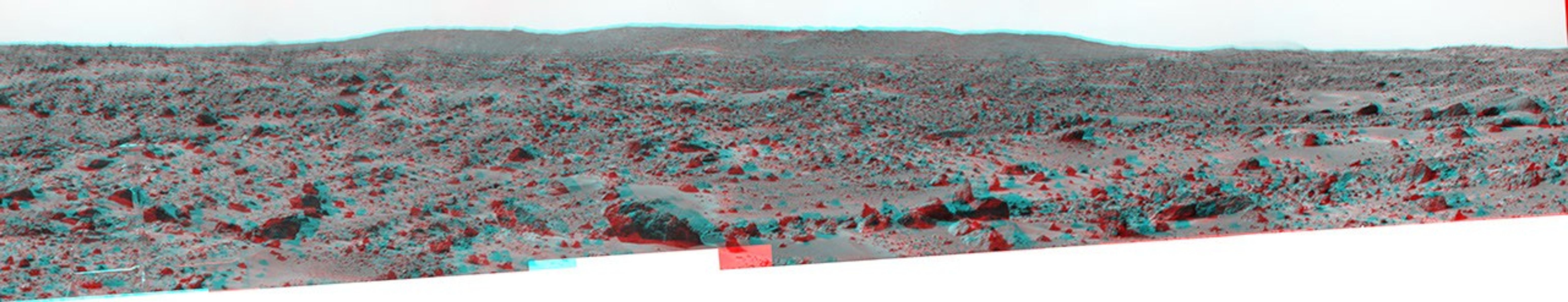 The "Big Crater" is actually a relatively small Martian crater to the southeast of the Mars Pathfinder landing site. It is 1500 meters (4900 feet) in diameter, or about the same size as Meteor Crater in Arizona. Superimposed on the rim of Big Crater (the central part of the rim as seen here) is a smaller crater nicknamed "Rimshot Crater." The distance to this smaller crater, and the nearest portion of the rim of Big Crater, is 2200 meters (7200 feet). To the right of Big Crater, south from the spacecraft, almost lost in the atmospheric dust "haze," is the large streamlined mountain nicknamed "Far Knob." This mountain is over 450 meters (1480 feet) tall, and is over 30 kilometers (19 miles) from the spacecraft. Another, smaller and closer knob, nicknamed "Southeast Knob" can be seen as a triangular peak to the left of the flanks of the Big Crater rim. This knob is 21 kilometers (13 miles) southeast from the spacecraft.