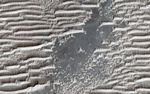 Our cutout covers the width of the color strip (1 kilometer) and is centered on a bare patch in a field of bright TARs. The illumination direction is from the top left, and the wind direction is from top to bottom. At first glance, these TARs look like they could be old, degraded versions of the TARs with which we are familiar. However, erosion tends to smooth things out and not create sharp edges where none existed previously. More likely, we are seeing TARs in the process of formation. The distinctive features of the TARs in Syria Planum -- the blunt edges, serrated ridges, and the asymmetric appearance of the surface -- are features that are more easily removed than created by erosion.