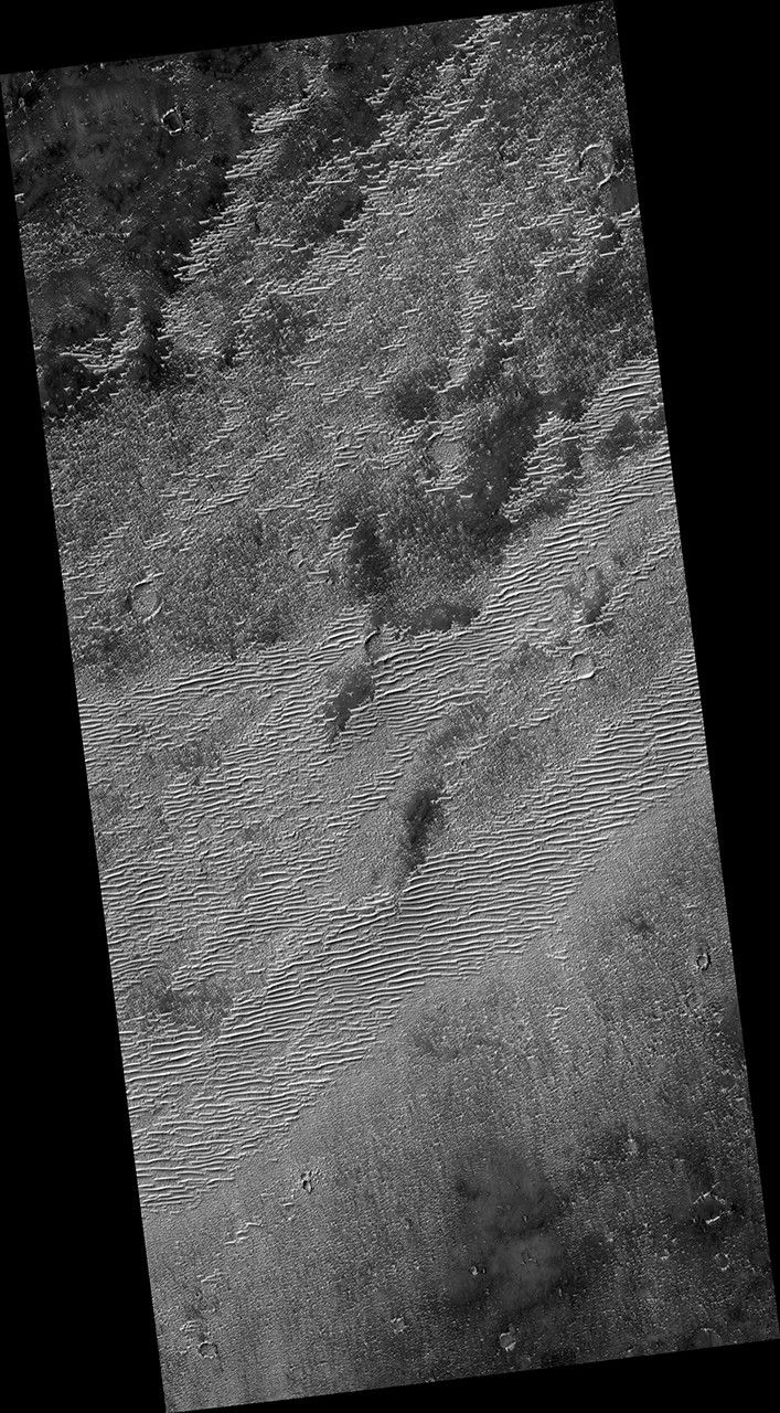 These strange features in Syria Planum are still being widely debated. They have the same general form as transverse aeolian ridges (TARs) elsewhere on Mars; windblown deposits that are common in the Martian tropics. Their height and spacing are similar to the more familiar looking TARs in other places, and they are similarly bright. Unless Nature is perverse, they were both made by the same process.
