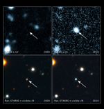 The bottom left image, taken by Pan-STARRS1, shows the galaxy (the bright dot in the center) in 2009 before the flare's appearance. The bottom right image, taken by Pan-STARRS1 from June to August 2010, shows the flare from the galaxy nucleus. Note how the light from the flare is much bluer, or hotter, than the host galaxy light.