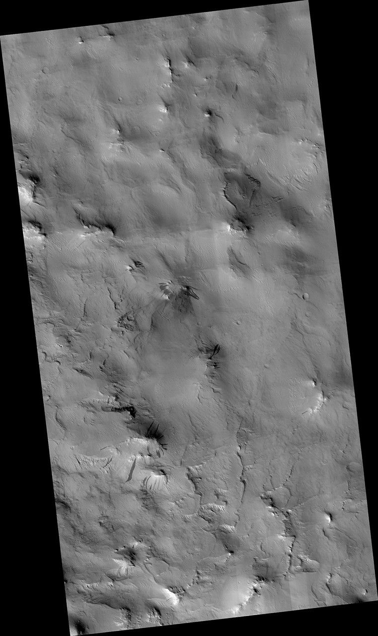 This meteorite hit a dusty area and made a crater, but did something a little more special to the surrounding dust. We can see dozens of dark, dust-free, streaks on slopes surrounding the crater. These slope streaks form when dust slumps downhill and happen naturally on a regular basis.