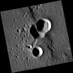 Located in Copland crater, this image consists of three small unnamed impact craters and a contractional ridge that was partly destroyed by the two superimposed impact craters at the center. At one point extensive volcanic eruptions took place within Copland, forming a smooth surface. As the lava cooled it contracted, causing fractures and ridges to form. Images such as this give scientists a better understanding of the processes that accompany flood volcanism on Mercury and other planetary bodies.