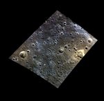 This image, located north of Rachmaninoff, features a possible volcanic vent to the east and an expanse of terrain that appears blue in this color view to the west. The depression's orange-yellow color and irregular shape are similar to other possible volcanic vents on Mercury. To the west of the large vent is a crater with an orange, irregularly shaped depression on its floor that may also be a vent. Vents on Mercury are indicative of explosive volcanism that was prevalent in Mercury's past.