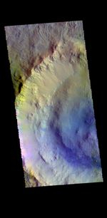 Today's image shows part of Bonestell Crater. Bonestell Crater is a relatively young crater located in Acidalia Planitia. Dust blown into the crater and the downslope movement of fine materials from the rim are slowly modifying the crater features. This material is responsible for the sand dunes visible at the bottom of the image. Dark blue tones in this false color combination typically indicate basaltic materials.