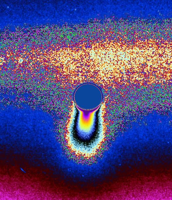 This color-coded image was processed to enhance faint signals, making the contours and extent of the fainter, larger-scale component of the plume easier to see.