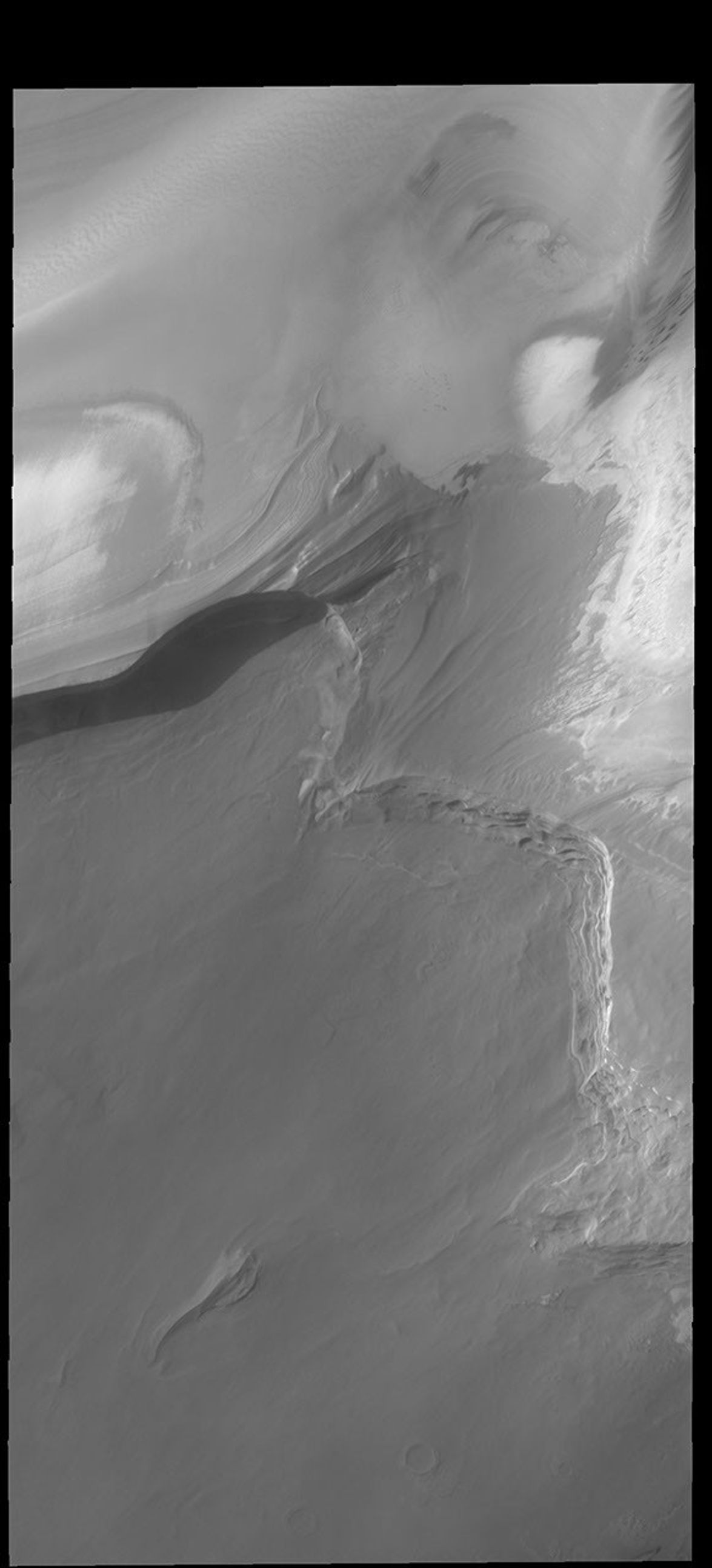This VIS image shows part of Boreum Cavus, at the interior end of Chasma Boreale. The layered polar ice is easily identified in the upper part of the image. Boreum Cavus is an arcuate region where the polar ice thins, revealing the rockier surface of Chasma Boreale.