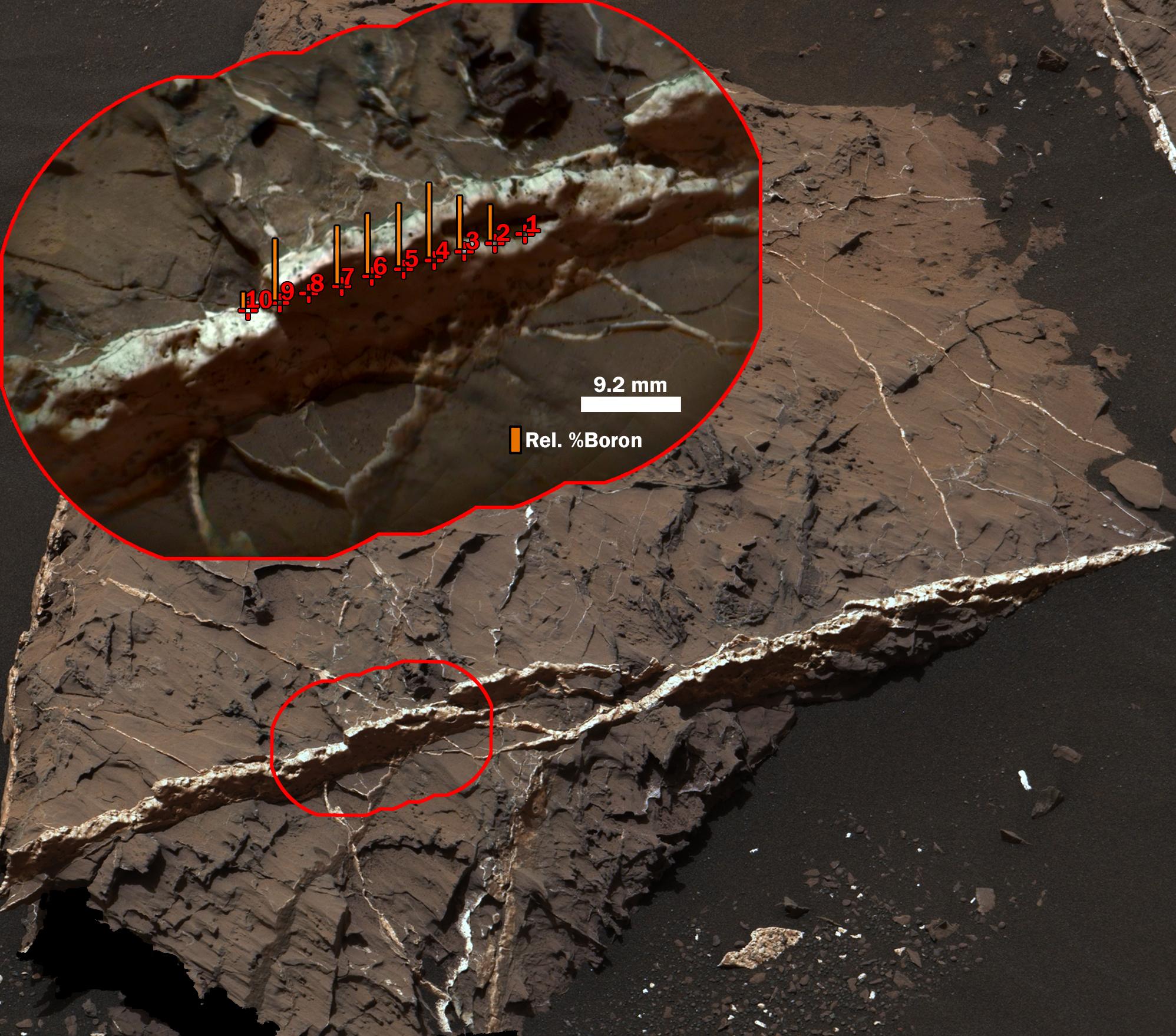 This two-part illustration shows the context of the erosion-resistant, raised vein, in an image from Curiosity's Mast Camera (Mastcam), and a detailed inset image from ChemCam's remote micro-imager. The inset includes indicators of the boron content measured at 10 points along the vein that were analyzed with ChemCam's laser-firing spectrometer. The vein's main component is calcium sulfate. The highest boron content identified is less than one-tenth of one percent. The heights of the orange bars at each point indicate relative abundance of boron, compared with boron content at other points.