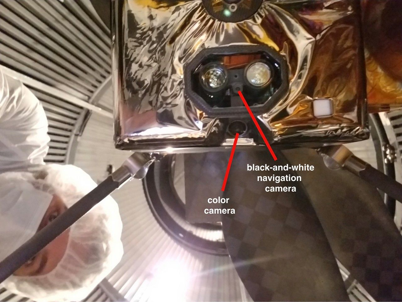 The helicopter's two cameras are visible in this view of the underside of Ingenuity: one looking straight down and the other at an oblique angle. In the octagonal black frame, the black-and-white navigation camera is the thick circle appearing between and just below the two larger lenses (parts of the laser altimeter that measures the helicopter's height above the ground). The color camera is the circle that is inset from the edge of the fuselage, appearing below the octagonal frame. (An annotated version of the image points out the cameras.) To protect against dust, a clear borosilicate window covers the altimeter and navigation camera, and a clear sapphire window covers the color camera.