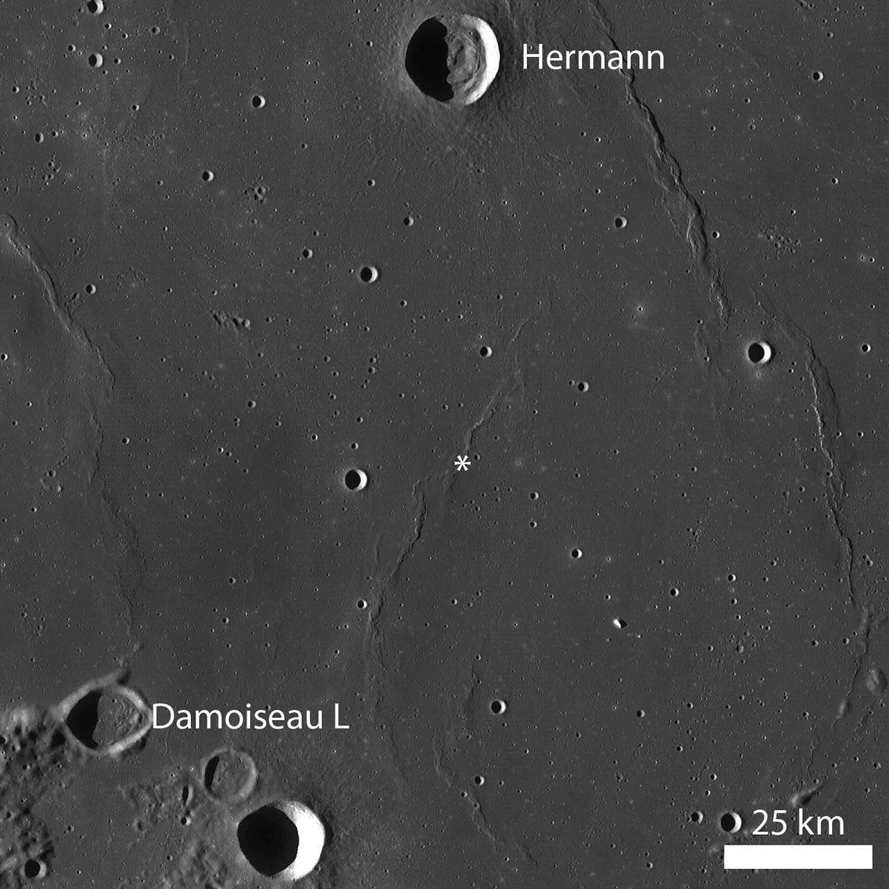 | LROC WAC monochrome mosaic featuring the wrinkle ridge in the opening image, noted with an asterisk |