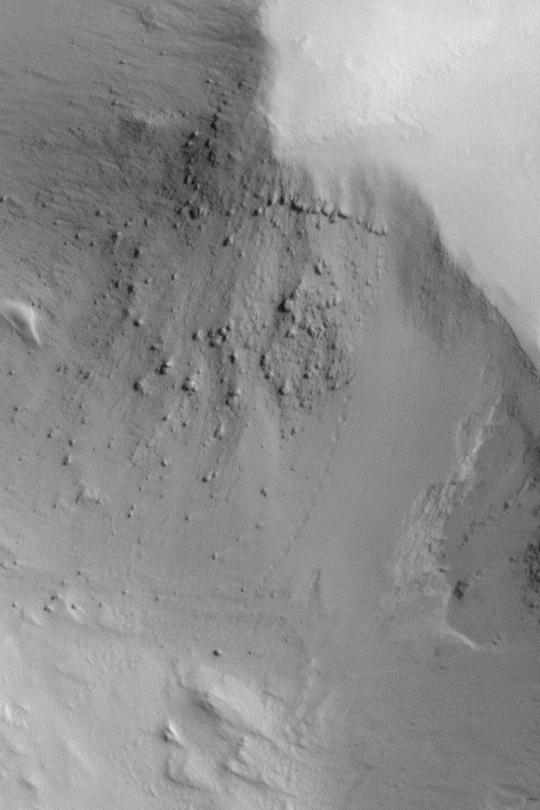 If a boulder rolls down a slope on an uninhabited planet, does it make a sound? While we do not know the sound made by a boulder rolling down a slope in the martian region of Gordii Dorsum, we do know that it made an impression. This full-resolution Mars Global Surveyor (MGS) Mars Orbiter Camera (MOC) image shows a series of depressions made on a dust-mantled slope as a boulder rolled down it, sometime in the recent past. The boulder track is located just right of center in this picture. The boulder sits at the end of the track. This picture was acquired in May 2003; it is located near 11.2°N, 147.8°W. North is toward the lower left, sunlight illuminates the scene from the right. The picture covers an area only 810 meters (about 886 yards) across.