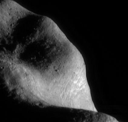 One of the most striking features in NEAR Shoemaker images of Eros' surface is the abundance of very large boulders. This image of the southwestern part of the saddle region, taken March 6, 2000, from a range of 201 kilometers (125 miles), shows a particularly boulder-rich part of the surface. Many of the huge rocks are 50 meters (164 feet) or more in diameter. They are believed to be fragments of Eros' native rock, shattered over the eons by formation of impact craters. The impacting projectiles themselves were pulverized by the impact process and survive only as fine debris mixed into the regolith.