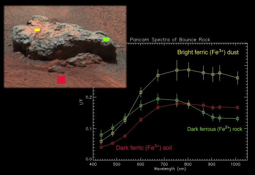 Figure 1 above is a plot of panoramic camera spectra extracted from three different regions on the rock dubbed "Bounce." The yellow spectrum is from the yellow box in the image on the left, from the dusty top part of the rock. The spectrum is dominated by the signature of oxidized "ferric" iron (Fe3+) like that seen in the classic Martian dust. The red spectrum is from the darker Meridiani Planum soils that were disturbed by the airbag when it bounced near the rock. That spectrum is also dominated by ferric iron, though the reflectivity is lower. Scientists speculate that this may be because the grains are coarser in these soils compared to the dust. The green spectrum, which is from the right side of the rock, shows a strong drop in the infrared reflectance that is unlike any other rock yet seen at Meridiani Planum or Gusev Crater. This spectral signature is typical of un-oxidized "ferrous" iron (Fe2+) in the rock, perhaps related to the presence of volcanic minerals like olivine or pyroxene. The possibility that this may be a basaltic rock that is distinctly different from the rocks seen in the Eagle Crater outcrop is being intensively explored using the rover's other instruments.