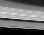 At the bottom, Saturn's moon Mimas (398 kilometers, or 247 miles across) orbits about 45,000 kilometers (28,000 miles) beyond the bright core of the F ring. The little moon is heavily cratered and is thought to be largely composed of water ice. The bright speck just outside of (below) the F ring is the shepherd moon Pandora (84 kilometers, or 52 miles across).