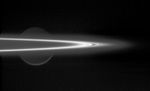 The searing arc of light seen here is Saturn's icy F ring, seen nearly edge-on. In the background, Rhea (1,528 kilometers, 949 miles across) is lit by reflected light from Saturn and the rings, with only the slightest sliver of light at its bottom being from direct sunlight.