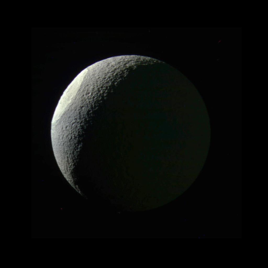 With the expanded range of colors visible to Cassini's cameras, differences in materials and their textures become apparent that are subtle or unseen in natural color views. Here, the giant impact basin Odysseus on Saturn's moon Tethys stands out brightly from the rest of the illuminated icy crescent. This distinct coloration may result from differences in either the composition or structure of the terrain exposed by the giant impact. Odysseus (280 miles, or 450 kilometers, across) is one of the largest impact craters on Saturn's icy moons, and may have significantly altered the geologic history of Tethys.