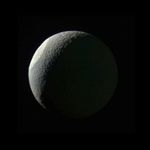 Tethys' dark side (at right) is faintly illuminated by reflected light from Saturn.