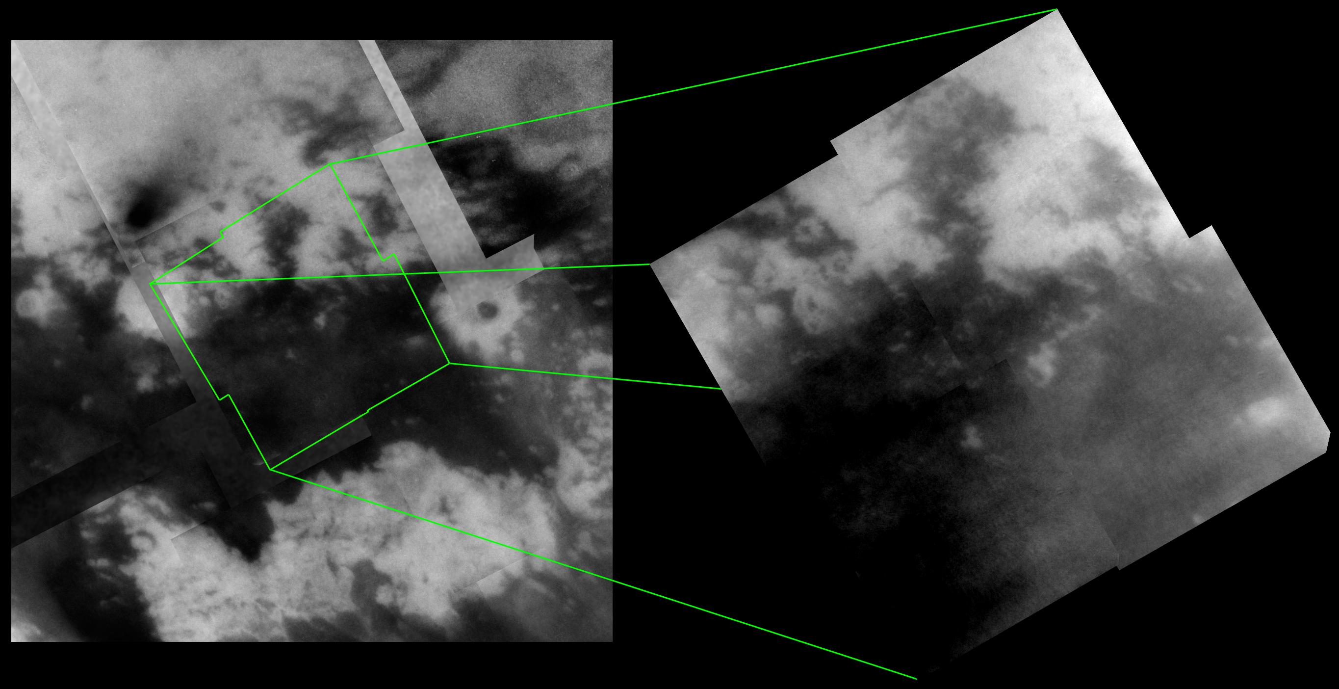 Data taken by the synthetic aperture radar experiment during the February 2005 flyby of Titan covers much of the region shown in the mosaic at right, particularly along its northern and western edges. For example, the bright oval-shaped feature (34 kilometers, or 21 miles across) near the lower right corner of the mosaic corresponds to the bright feature seen in the lower left corner of a previously released radar image from February (see PIA07368). Comparing the same features as seen by different instruments will be important in understanding how these features formed. Furthermore, it will help to constrain what exactly each instrument is detecting (i.e., surface roughness vs. brightness, surface vs. subsurface, topographic effects, etc.).