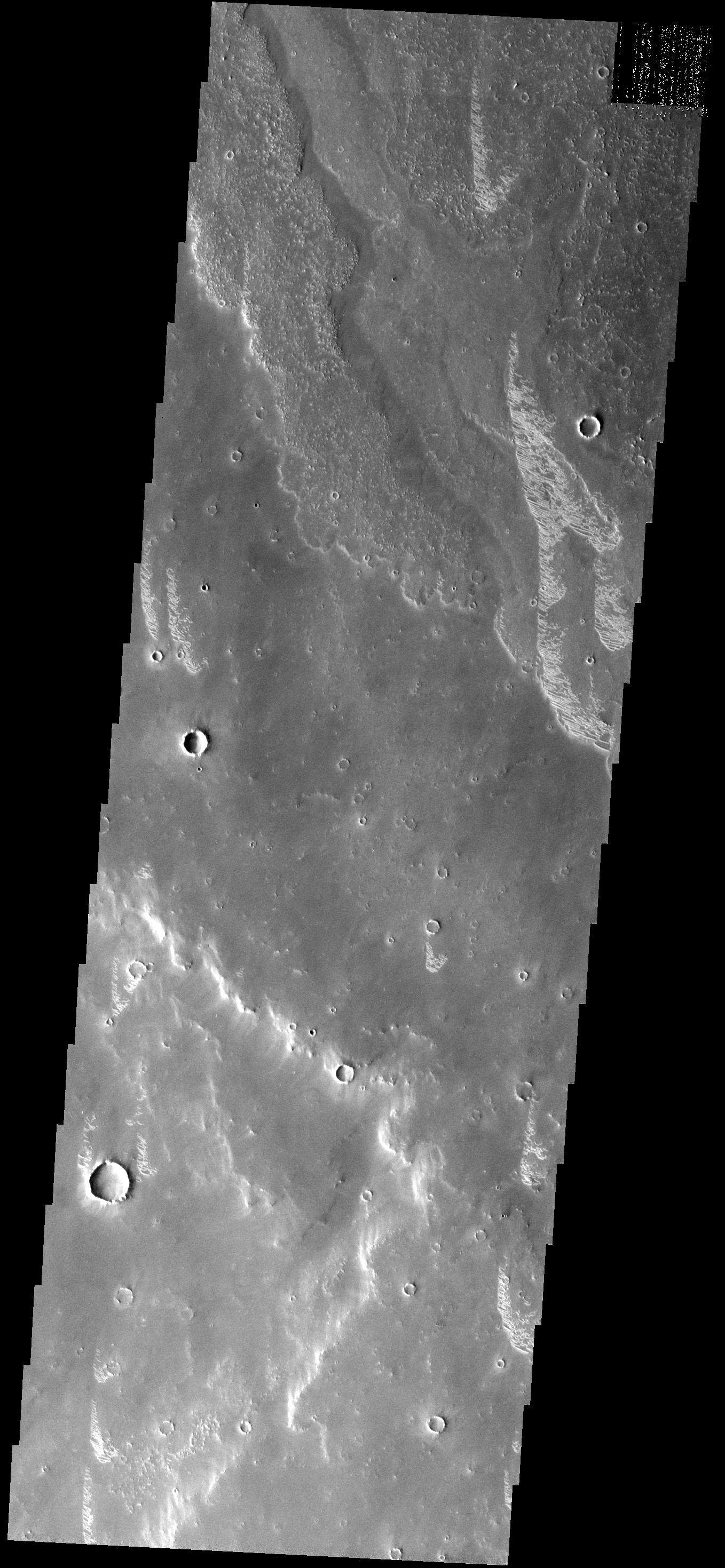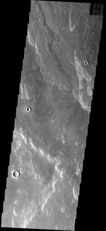 Note: this THEMIS visual image has not been radiometrically nor geometrically calibrated for this preliminary release. An empirical correction has been performed to remove instrumental effects. A linear shift has been applied in the cross-track and down-track direction to approximate spacecraft and planetary motion. Fully calibrated and geometrically projected images will be released through the Planetary Data System in accordance with Project policies at a later time.