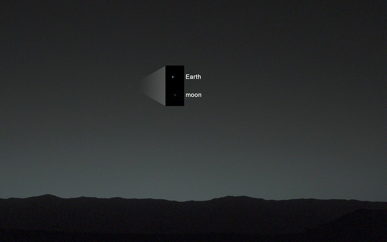This view of the twilight sky and Martian horizon taken by NASA's Curiosity Mars rover includes Earth as the brightest point of light in the night sky. Earth is a little left of center in the image, and our moon is just below Earth. Two annotated versions of this image are also available in Figures 1 and 2.