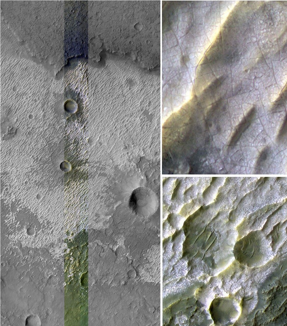 This image provides higher-resolution views of a site where another observation (PIA10247) indicates the presence of chloride salt deposits. The High Resolution Imaging Science Experiment (HiRISE) camera on NASA's Mars Reconnaissance Orbiter took this image on March 30, 2007. The colors resemble natural appearance, but are not true color. The chloride mineral deposit looks bright in tone, like salt pans on Earth. The deposit seems to be emerging as overlying material erodes away.
