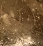 This color picture of Ganymede in the region 30 S 180 W shows features as small as 6 kilometers (3.7 miles) across. Shown is a bright halo impact crater that shows the fresh material thrown out of the crater. In the background is bright grooved terrain that may be the result of shearing of the surface materials along fault planes. The dark background material is the ancient heavily cratered terrain -- the oldest material preserved on the Ganymede surface.