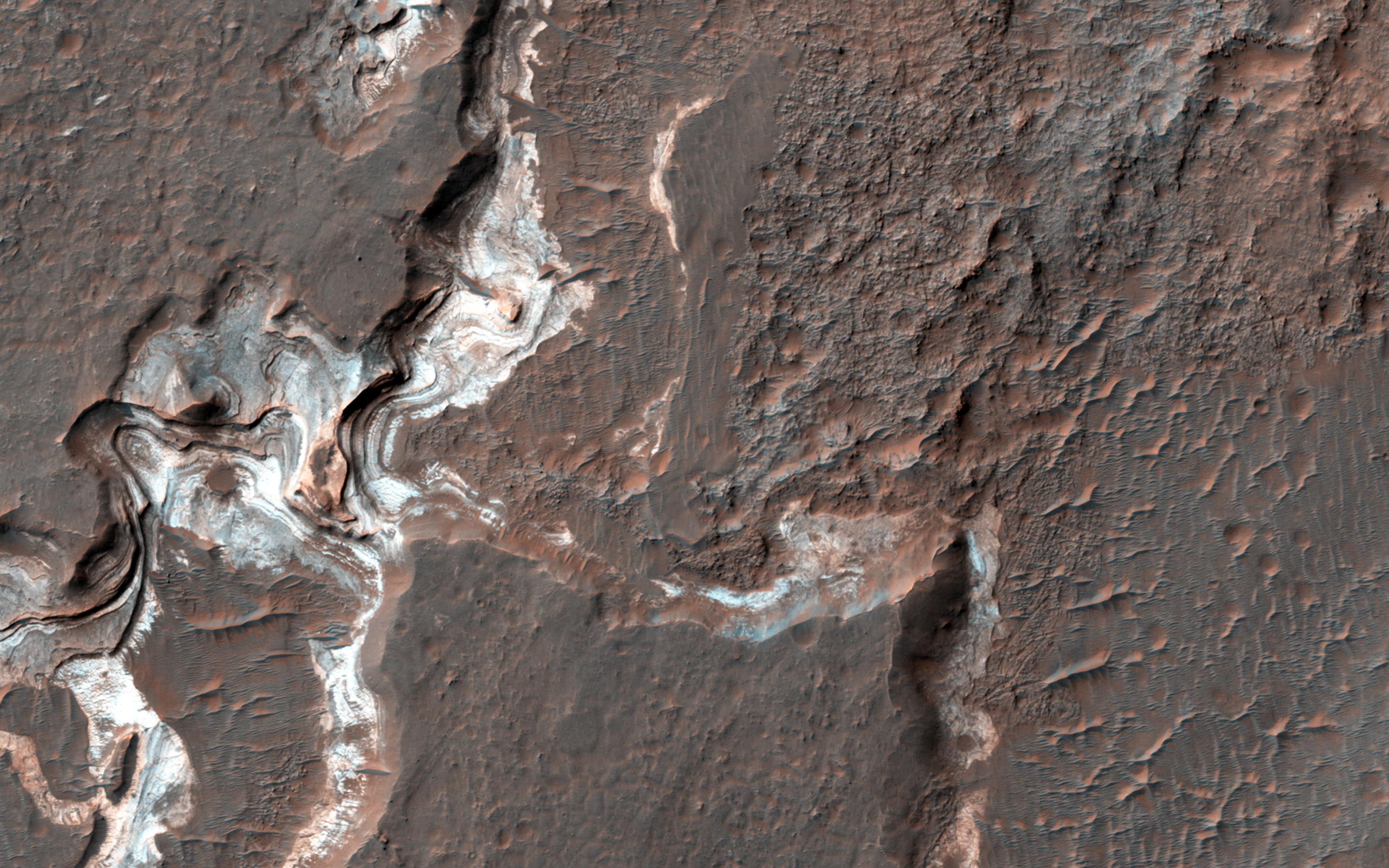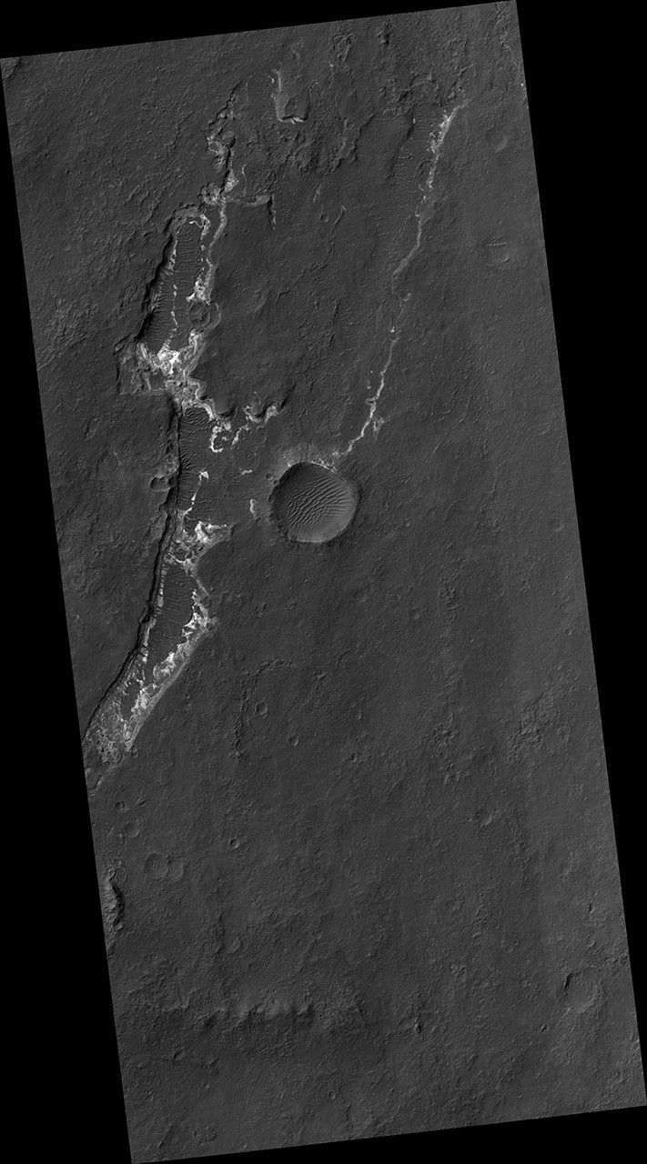 There is a large channel system that flows into the basin, called Ladon Valles, and scientists think that the basin may have once filled with water before another channel to the north formed and drained it. These exposures of light-toned layered sediments provide clues about the environment that existed within Ladon Basin when water may have ponded and deposited these sediments.