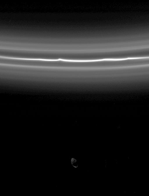Saturn's moon Pandora is almost overwhelmed by the brightness of the F ring in this view. The F ring's bright core displays kinks and is flanked by fainter ringlets. Imaging scientists recently determined these fainter ringlets to be a single spiral ring that winds around the planet. Pandora is 84 kilometers (52 miles) across.