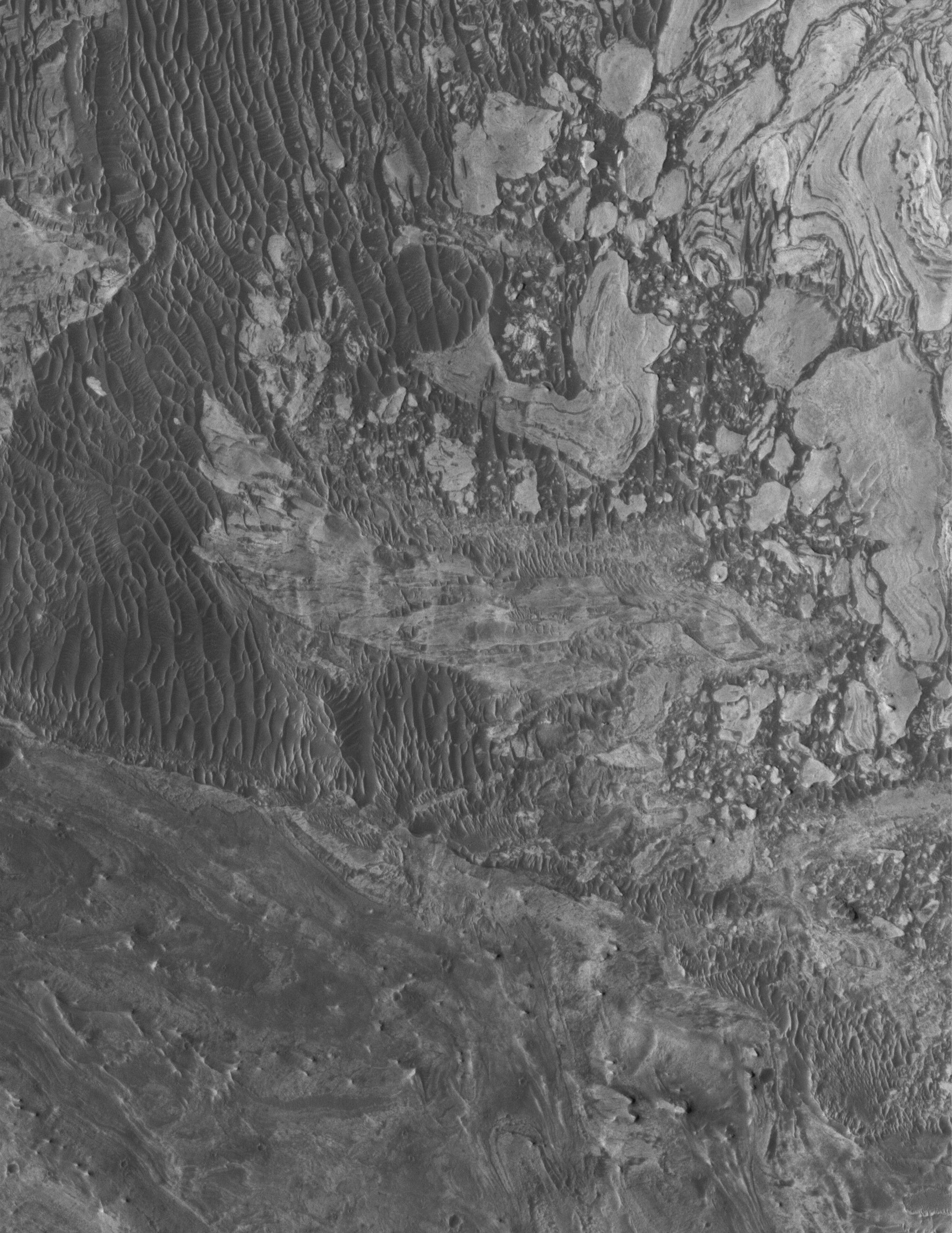 This Mars Global Surveyor (MGS) Mars Orbiter Camera (MOC) image shows broken-up blocks of sedimentary rock in western Candor Chasma. There are several locations in western Candor that exhibit this pattern of broken rock. The manner in which these landforms were created is unknown; it is possible that there was a landslide or a meteoritic impact that broke up the materials. One attribute that is known: in some of these cases, it seems that the rock was broken and then buried by later sedimentary rocks, before later being exhumed so that they can be seen from orbit today.