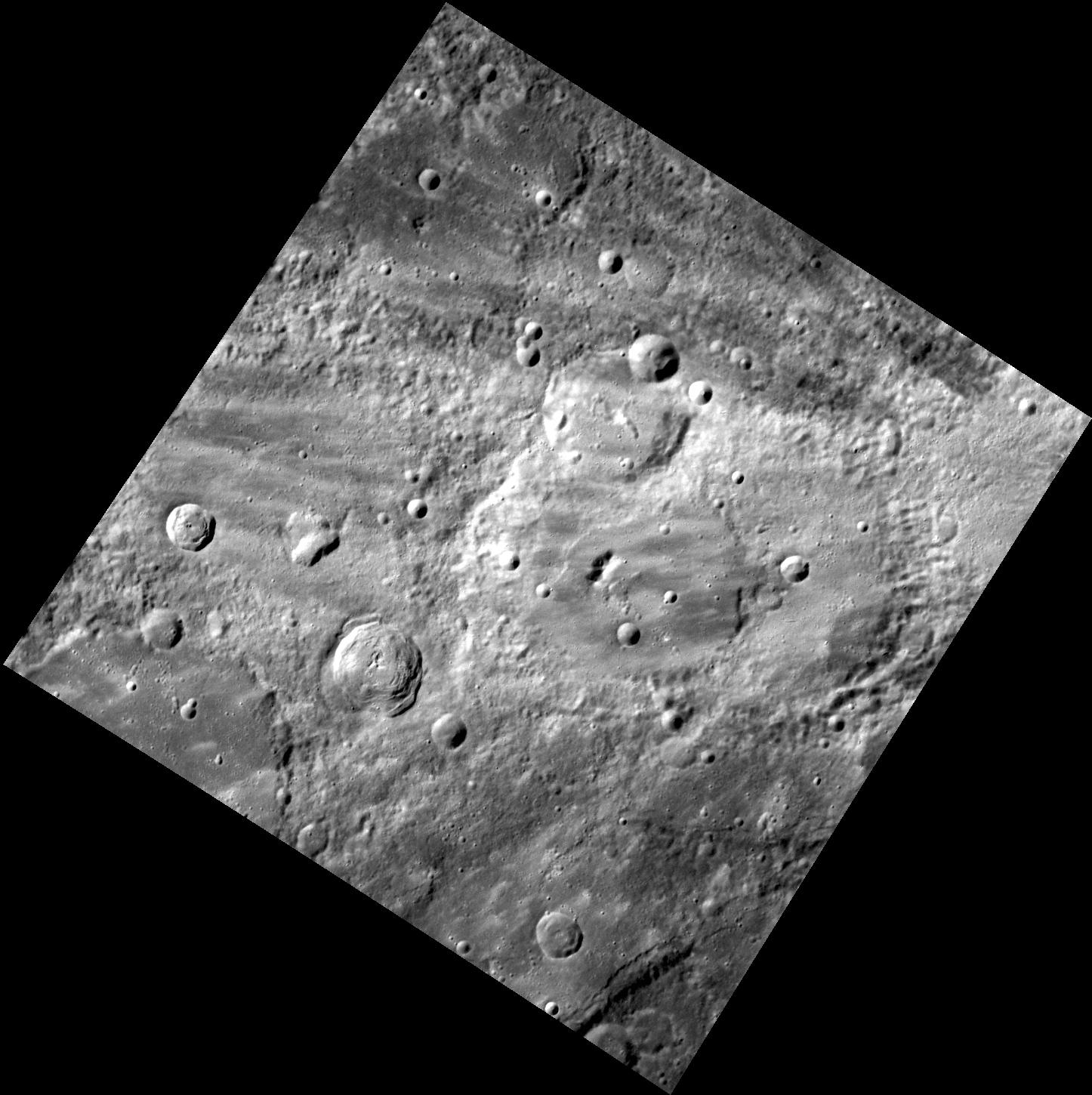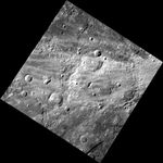 The image above depicts an old, heavily cratered surface that is covered in rays from the nearby crater Fonteyn. Fonteyn is not visible in this view but is located approximately 100 miles to the east of the center of this image. This is a particularly striking image because of the visible contrast between the surface and the rays that overprint it.