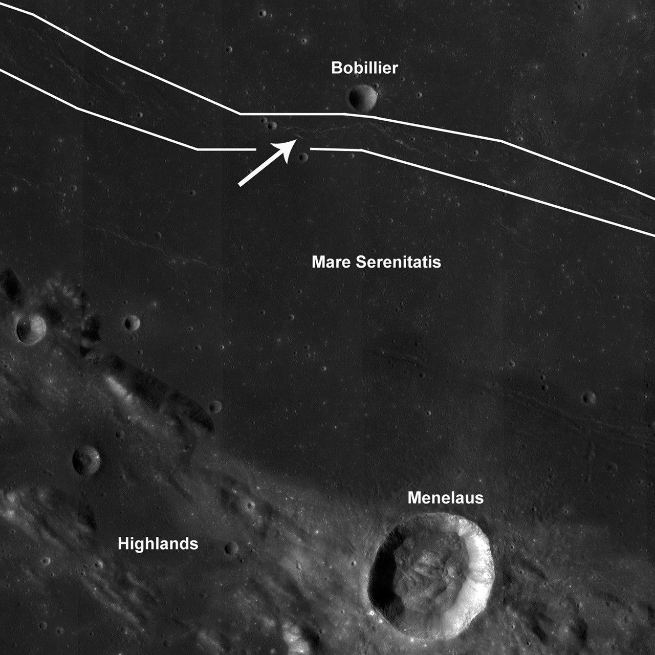 WAC 100 m/pixel monochrome mosaic of the area around part of Dorsum Buckland (outlined in white lines). The arrow points to the location of today's featured image