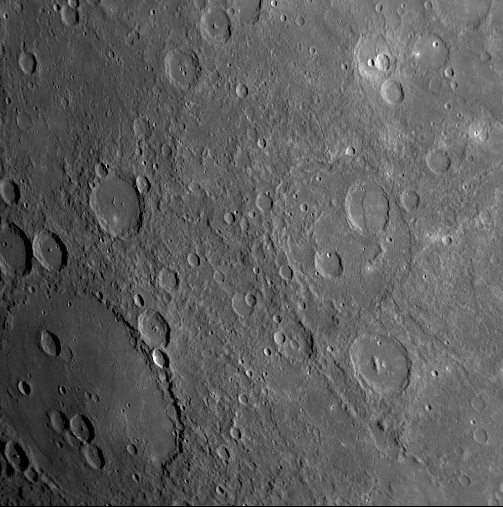 This NAC image shows two named craters on Mercury: Raphael, named for the Italian Renaissance painter and Repin, named for the Russian painter of the late 1800s and early 1900s. Raphael is being illuminated by morning sunlight on Mercury, resulting in longer shadows on the left side of the image than on the right side. Repin is the smaller of the two craters (at a diameter of 107 kilometers, or 66 miles) and has a central peak structure. Raphael is a much larger impact feature, and with a diameter of 343 kilometers (213 miles) it would normally be classified as an impact basin. Interestingly, although Raphael is considerably larger than Repin, Raphael does not show any peak structure, such as the peak rings observed in other impact basins of similar or somewhat smaller diameter, of which Raditladi is one example shown in a previously released image (see PIA10378). The floor of Raphael is also noticeably smooth, suggesting the presence of volcanic plains that have partially filled this basin. If the accumulated lava flows were sufficiently thick, they might have buried any original topography within the basin. Indeed, some subtle wrinkle ridges around the basin floor may hint at the location of a large interior ring of peaks that has been covered over.