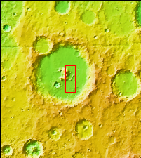 Today's VIS image covers part of the central peak and floor of Burton Crater. The central peak slopes are covered with numerous dark streaks. There are several suggested mechanisms to form these features. Two of the mechanisms are that the dusty surface has been altered to reveal darker rock beneath from motion of downward moving dust, or the surface is darkening by fluid or other surface staining.