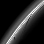 Half an hour after Prometheus tore into this region of Saturn's F ring, the Cassini spacecraft snapped this image just as the moon was creating a new streamer in the ring.The dark pattern shaped like an upside down check mark in the lower left of the image is Prometheus and its shadow. The potato shaped moon can just be seen coming back out of the ring.
