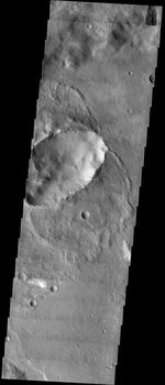 In the heavily cratered southern highlands of Mars, the type of crater seen in this THEMIS visible image is relatively rare. Elliptical craters with "butterfly" ejecta patterns make up roughly 5% of the total crater population of Mars. They are caused by impactors which hit the surface at oblique, or very shallow angles. Similar craters are also seen in about the same abundance on the Moon and Venus.