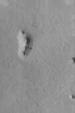 This Mars Global Surveyor (MGS) Mars Orbiter Camera (MOC) image shows three small buttes in the Memnonia Sulci region of Mars near 10.5°S, 176.1°W. The buttes are remnants of formerly more extensive layered rock that once covered the region. The larger butte has several dark slope streaks formed by downslope movement (landsliding/avalanching) of dust. The picture covers an area about 3 km (1.9 mi) across. Sunlight illuminates the scene from the left.