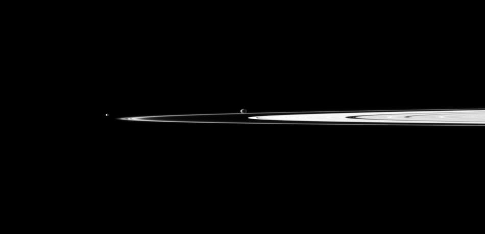 Janus (179 kilometers, or 111 miles across) is near the center of the image and is farther than the rings from Cassini. Pandora (81 kilometers, or 50 miles across) is on the left. This view looks toward the northern, sunlit side of the rings from just above the ringplane.