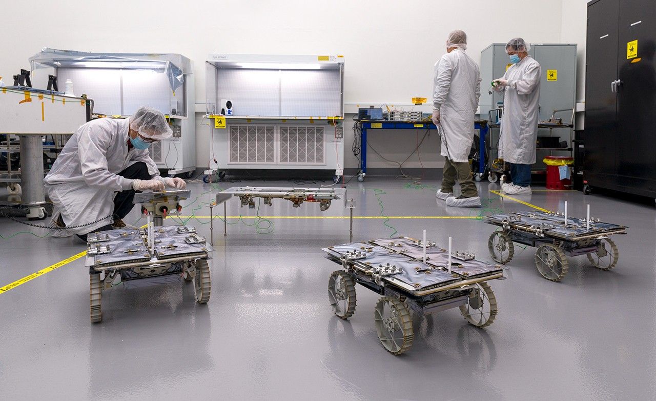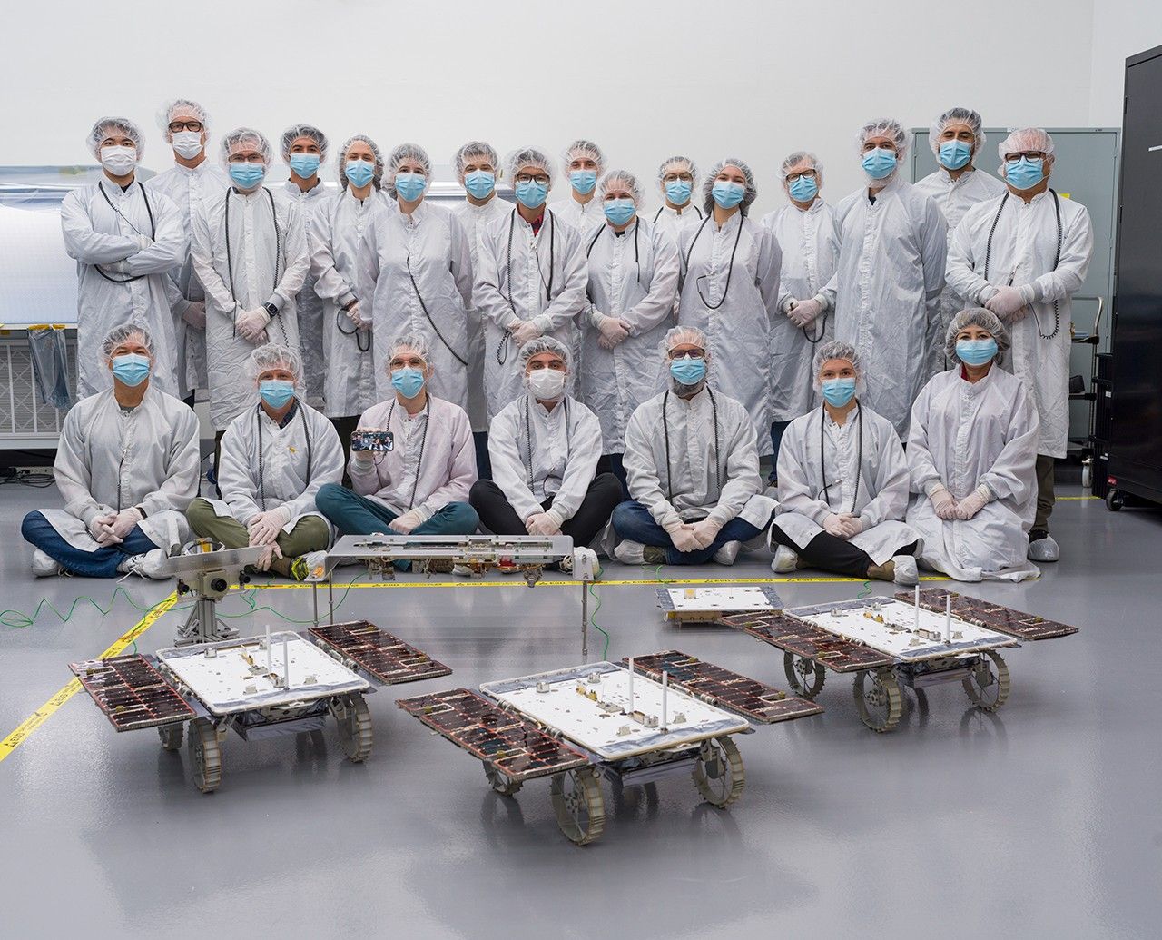 Members of the assembly, test, launch, and operations team for NASA's CADRE (Cooperative Autonomous Distributed Robotic Exploration) project pose in a clean room at the agency's Jet Propulsion Laboratory in Southern California on Jan. 26, 2024, with three lunar rovers after their completion.